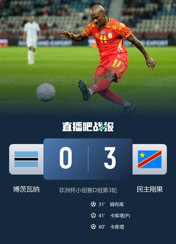 民主刚果3-0博茨瓦纳,以小组第二成功晋级。