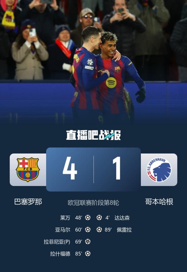 直通16强!巴萨4-1逆转哥本哈根 亚马尔传射莱万破门拉菲尼亚点射