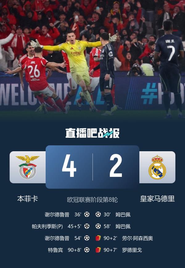 皇马2-4不敌本菲卡,皇马排名欧冠联赛阶段第9位,无缘直通16强,将打附加赛;本菲卡最终排名第24位,压哨进入附加赛。