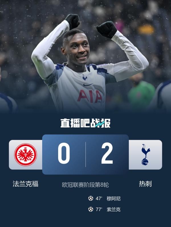法兰克福0-2热刺。积分榜方面,热刺锁定前八直通16强,法兰克福4分第33被淘汰。
