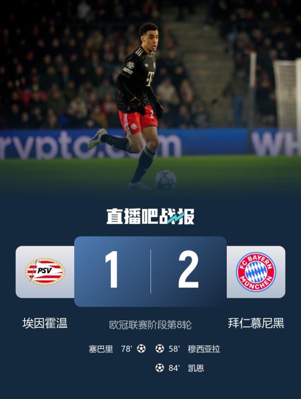 拜仁2-1埃因霍温,欧冠联赛阶段第二直接晋级十六强。