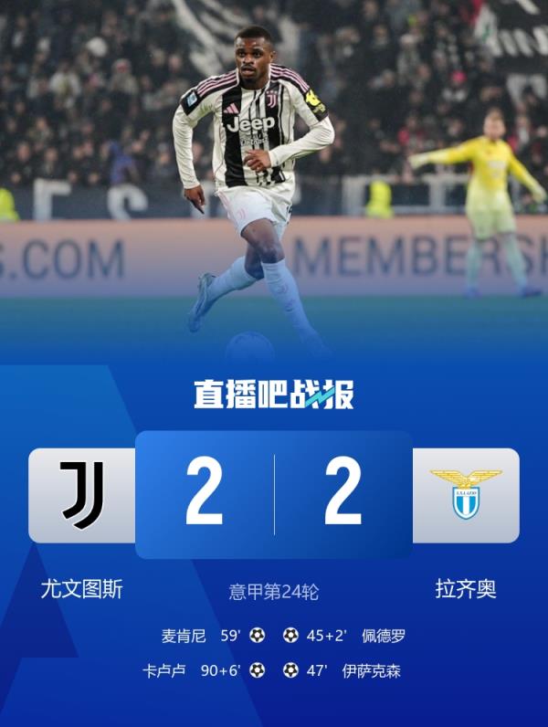 尤文本轮2-2绝平拉齐奥,麦肯尼破门,卡卢卢96分钟绝平。