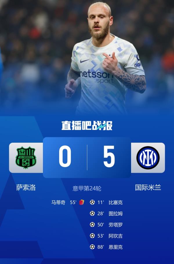 国米5-0横扫萨索洛,各项赛事5连胜,8分领跑积分榜。