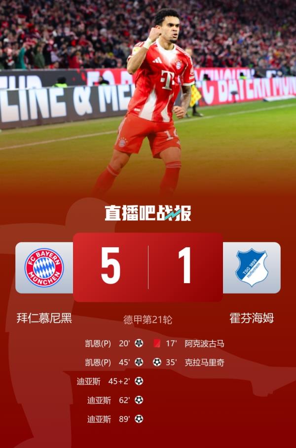 6分领跑!拜仁5-1十人霍芬海姆 迪亚斯戴帽+两度造点凯恩点球双响