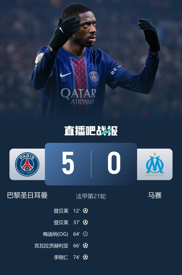 巴黎圣日耳曼5-0马赛,赢下法国国家德比,取得两连胜,2分优势领跑积分榜。