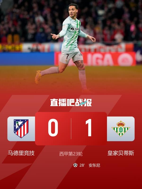 两轮不胜!马竞0-1贝蒂斯仍居第三 安东尼世界波略伦特乌龙被吹