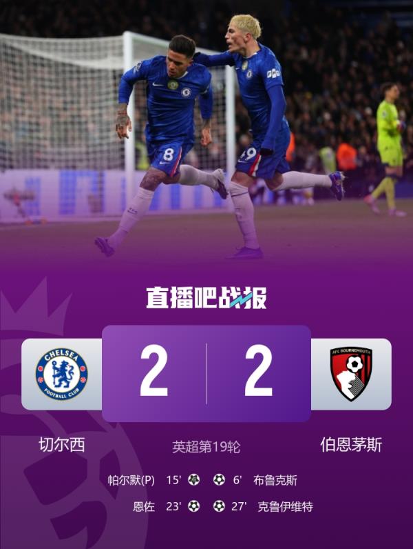 切尔西2-2战平伯恩茅斯,蓝军近7轮仅取得1场胜利。