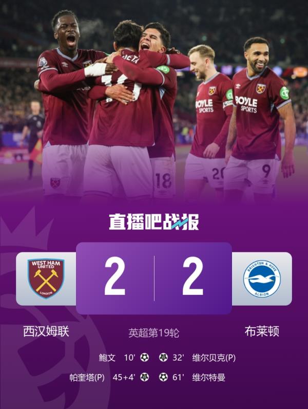 西汉姆2-2布莱顿,此役后铁锤帮八轮不胜仍处降级区。