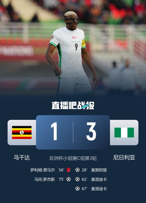 尼日利亚3-1战胜乌干达,奥涅迪卡本场双响。