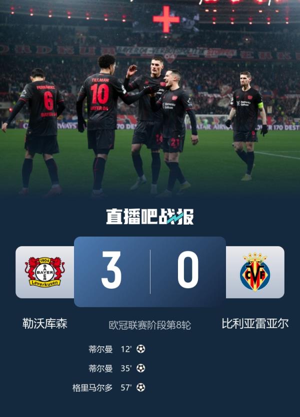 勒沃库森3-0完胜黄潜,将战附加赛;黄潜8场仅1分出局。