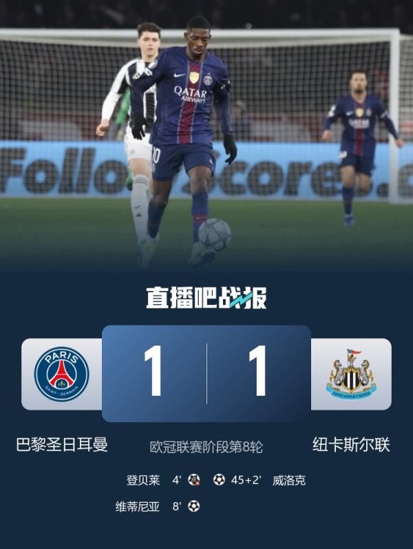 将战附加赛!巴黎1-1纽卡 维蒂尼亚远射闪击登贝莱失点K77伤退