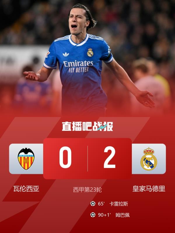 联赛7连胜!皇马2-0瓦伦西亚距榜首1分 卡雷拉斯一条龙姆巴佩破门